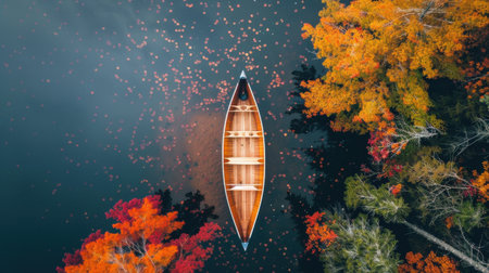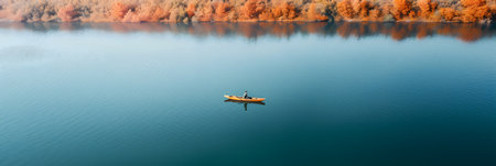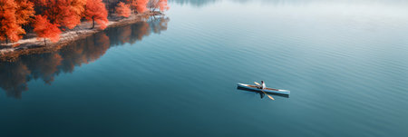 Person rowing on a calm lake in autumn, aerial view only small boat visible with serene water around