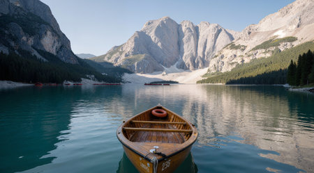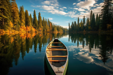 A peaceful canoe gently floats on a still lake, surrounded by vibrant, lush forests and majestic towering mountains. Generative AI