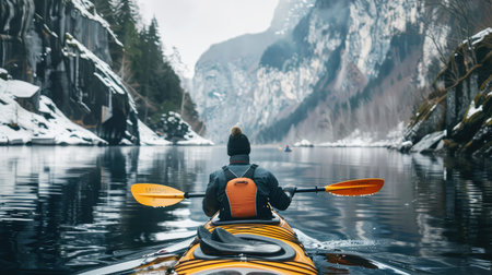 rear view of a man paddling a kayak in winter on a mountain lake surrounded by snow-covered rocks