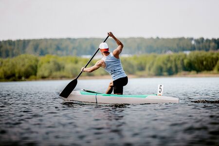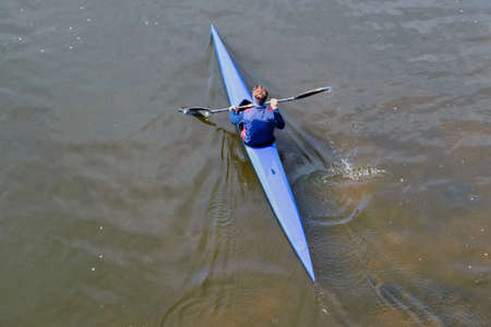 MOSCOW, RUSSIA - AUGUST 25, 2019: Kayaker man, kayaks on river, man boating on river.