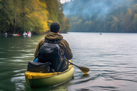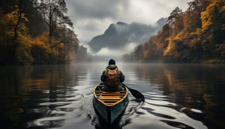 Rear view of a fisherman paddling a canoe across a misty lake on a foggy autumn morning, surrounded by serene nature and calm waters
