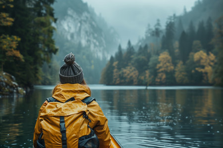 Person in Bright Yellow Jacket Canoeing on Calm Lake Surrounded by Autumn Forest in Misty Mountains