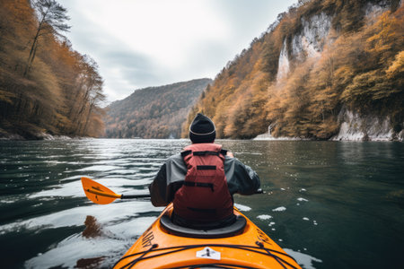 Man kayaking on the river in the mountains. Active lifestyle concept, A person's rear view enjoying an eco-friendly activity of kayaking, AI Generated