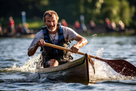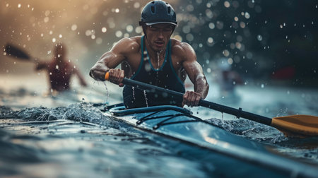 Skillful Man rows an oar in a canoe. River summer kayaking sport. Generate Ai