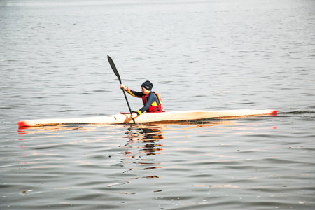 A young man paddles across a calm lake at sunset. The warm light creates a serene and peaceful atmosphere.
