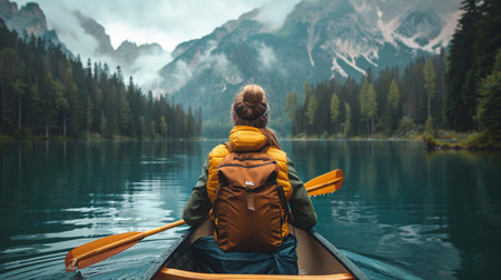 Woman kayaking in serene stream with stunning picturesque landscape in the background