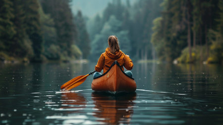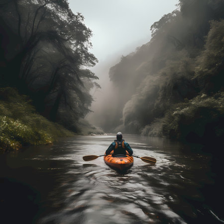 A person in a bright orange kayak navigates through dark, reflective waters. The serene environment highlights the beauty of outdoor adventure and water sports. Generative AI