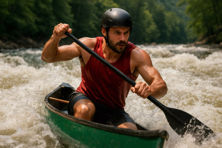Canoeist paddles through river rapids, navigating the challenging whitewater with skill and determination
