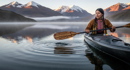 Kayaking on a calm lake in the mountains during a beautiful sunrise