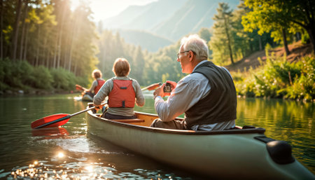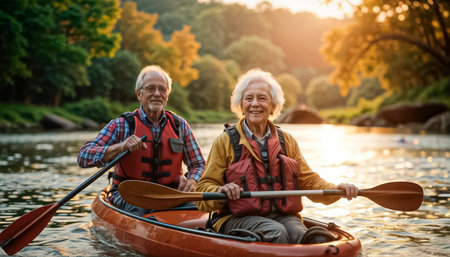 Two seniors kayaking on a peaceful lake at sunrise, enjoying the tranquility of nature and golden light reflecting on the water