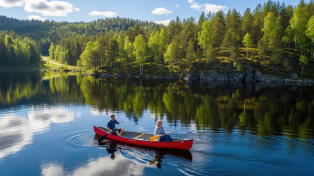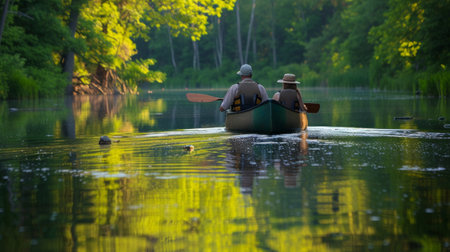 A couple in a canoe, paddling gently along a tranquil river, their reflections mirrored on the water's surface.
