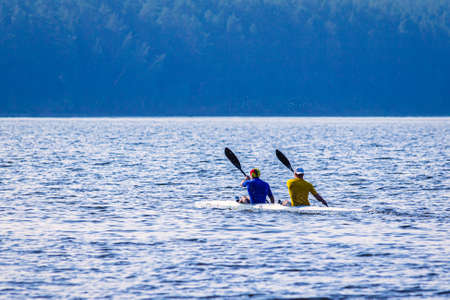 Two kayakers rowers on the lake. The concept of a healthy lifestyle