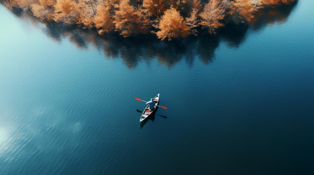 rowing on a calm lake in aerial view only small boat visible with serene water around vertical banner with copy space for