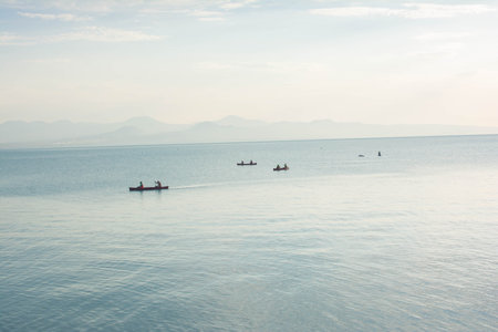 blue sea water, red yellow boat with oars floats, two people sport background Dubrovnik, Croatia April 22, 2023. High quality photo