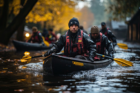 group of athletes canoeists boating on lake in a kayak. water spray from oars