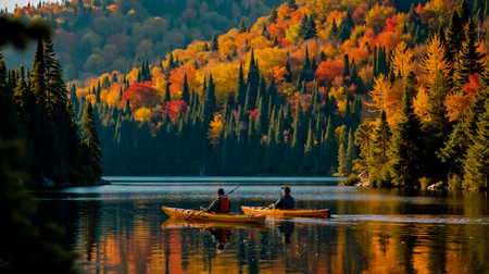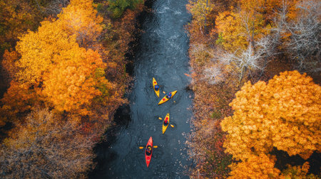 Kayakers paddle through a winding river, surrounded by trees adorned in autumn hues, showcasing a lively and adventurous atmosphere in the colorful landscape.