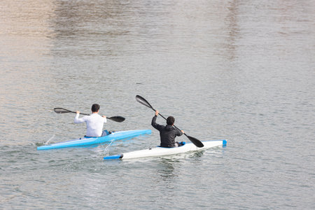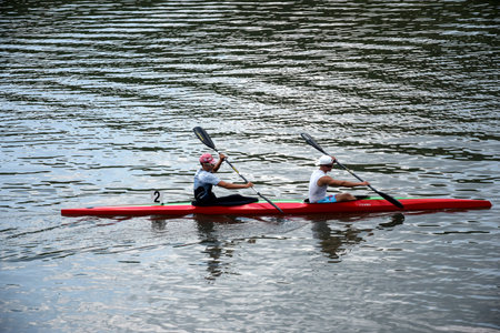 Two athletes are sailing canoe on river, controlling oars. Active outdoor sports training. back view. copyspace. Chisinau, Moldova - July 2021