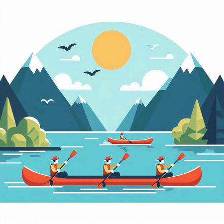 Outdoor vector scene with two men rowing canoes on a calm river, with mountains in the background and a clear sky above. Perfect for water sports and adventure-themed designs. -
