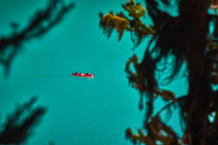 Photo of two couples, each in a red canoe, paddling in a blue-green glacier-fed lake; the couples are seen from an elevated viewpoint and are surrounded by nothing but the water of the lake. Perfect for illustrating a quiet retreat, the stillness of wilde