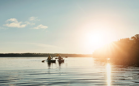 Rowers in sleek canoes glide through shimmering water, creating mesmerizing pattern. sunlight reflects off surface, enhancing serene atmosphere of teamwork and dedication