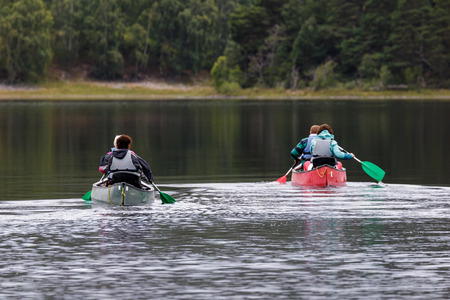 Couple rowing a canoe on the lake. Beautiful summer landscape.