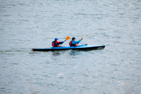 SANTA CRUZ, CA/USA -January 7 - undentified caucasian couple kayaking in blue water on January 7, 2015 in Santa Cruz Bay