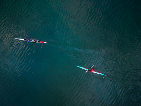 Above view on young rowers who have a competition in rowing kayaks on the river.