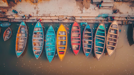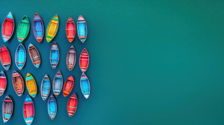Aerial view of colorful wooden boats lined up on serene water, showcasing a vibrant palette and peaceful atmosphere.