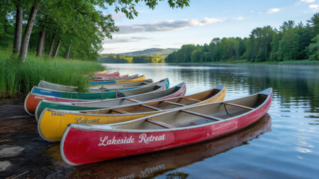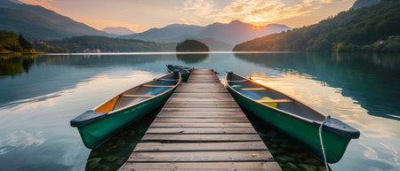 A serene sunrise reflects on a calm lake with two canoes docked on a wooden pier, inviting a peaceful morning paddle in the embrace of nature