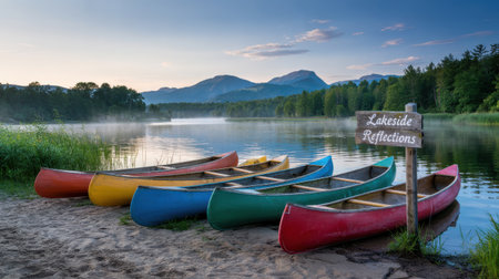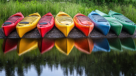 A stunning arrangement of vibrant kayaks resting peacefully on a shoreline, with their colorful reflections mirrored in calm water, amidst lush green surroundings.