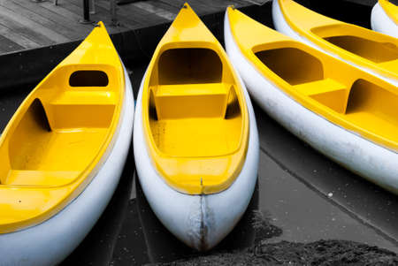 Yellow plastic kayak boats stand in parking lot, sunset light. Concept trip on river lake.