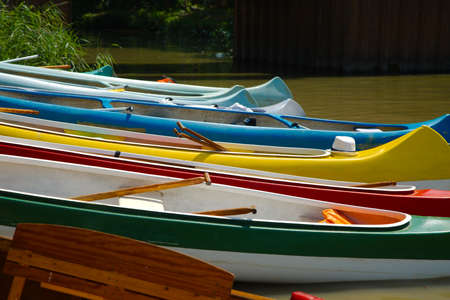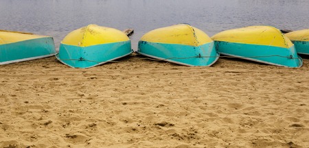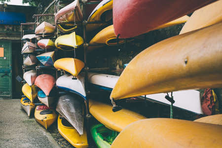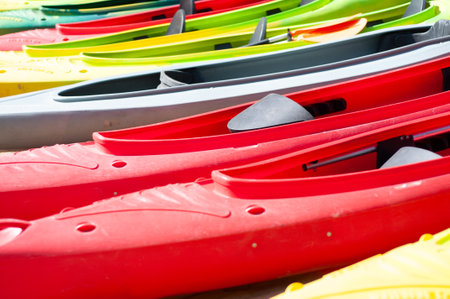 Colored kayak canoes on the sea beach. Summer holidays and activities on the water. Vacation, relax, sport concept.
