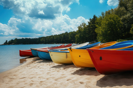 Colorful kayaks on a sandy beach. Beachside leisure equipment. Concept of water sports, beach activity, and vibrant summer fun.