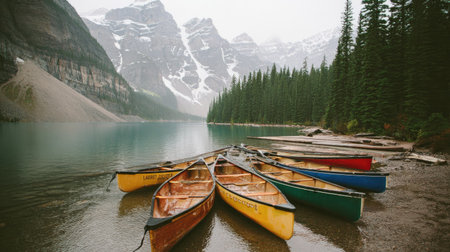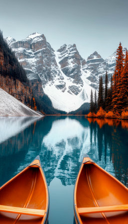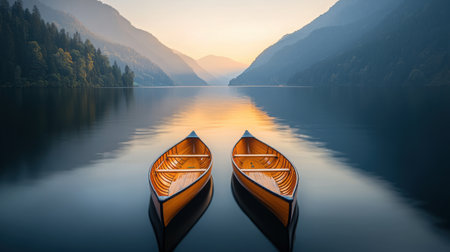 This breathtaking image showcases two classic wooden canoes on a tranquil lake, surrounded by towering mountains and soft morning light.