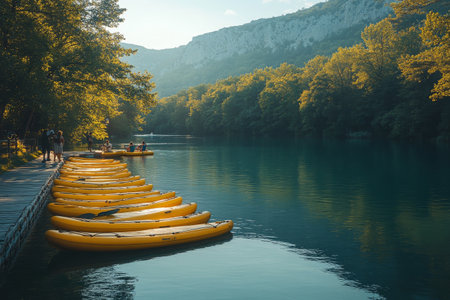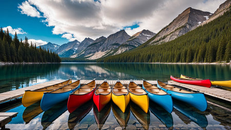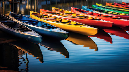 This canoes beautifully arranged on a wooden dock by a tranquil lake. AI generated image