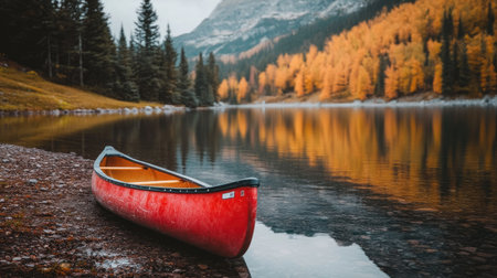 A captivating image of a canoe resting on the shore of a mountain lake, with stunning reflections of the surrounding mountains and trees in the water, inviting outdoor enthusiasts to explore.