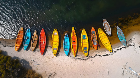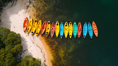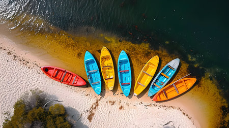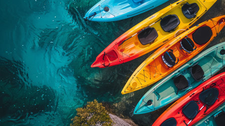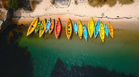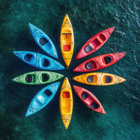 A stunning aerial view of colorful kayaks arranged in a flower pattern on sparkling blue water, encapsulating the essence of summer adventure and leisure activities.