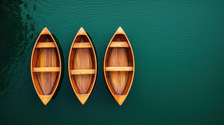 Three elegant wooden rowboats gently float on a serene turquoise surface, creating a peaceful and tranquil scene ideal for nature enthusiasts.