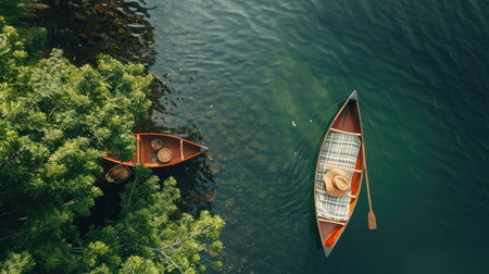 An aerial view of two boats peacefully floating on the serene lake surrounded by natural landscape with trees, grass, and other terrestrial plants AIG50
