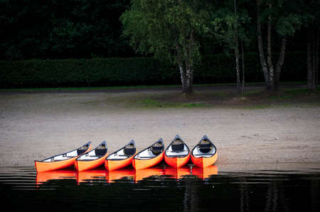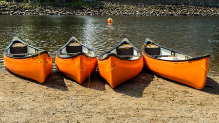 Four orange kayaks berthed on a sandy lake beach beside a lake