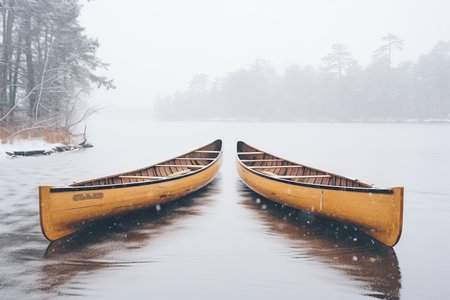Two vibrant yellow canoes are docked side by side on a tranquil lake, surrounded by a snowy forest. Flurries of snow fall gently, creating a serene winter atmosphere.