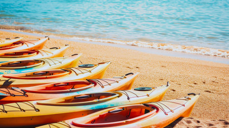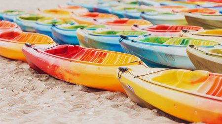 Row of colorful kayaks on a sandy beach against clear blue waters. Beachside leisure equipment. Concept of water sports, beach activity, and vibrant summer fun.