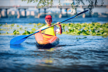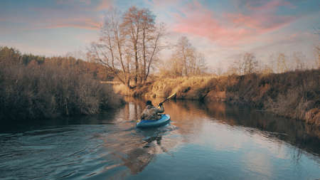 Young man rowing kayak on river at sunset. Guy ready to start canoeing in summer