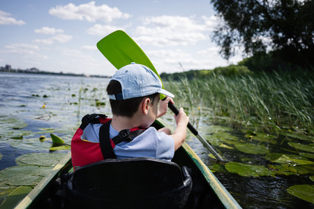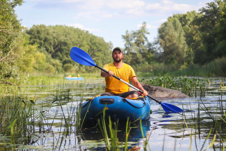 Man in a inflatable kayak rowing in calm river among the green leaves of water lilies in forest. Kayaking in wildlife at summer time.