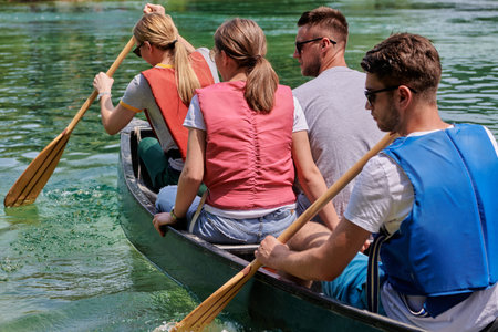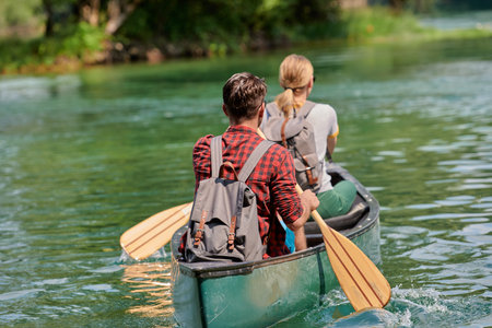 Couple adventurous explorer friends are canoeing in a wild river surrounded by the beautiful nature