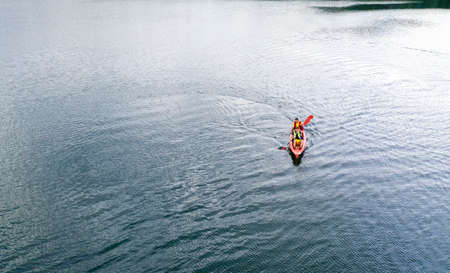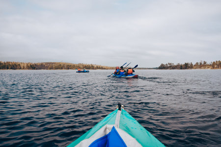 Active holidays on the lake, kayaking on the water, tourism on a cloudy day