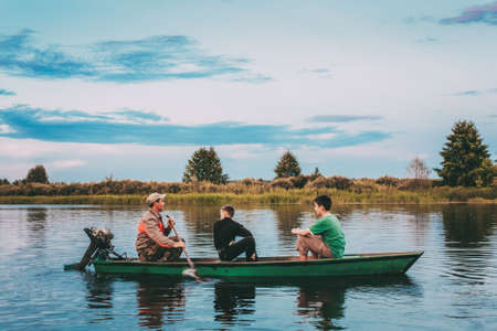 Belarusian Man And Two Boys Sailing In Old Boat On River At Sunset Of Summer Day