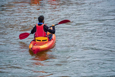 MOSCOW, RUSSIA - AUGUST 25, 2019: Kayaker man, kayaks on river, man boating on river.