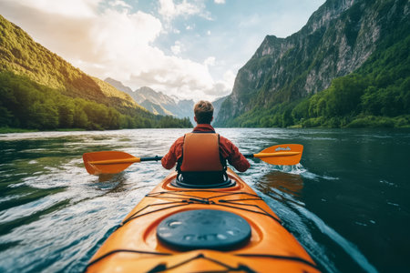 Extreme kayaking adventure man navigates mountain river in thrilling outdoor sport experience