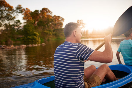 Paddling off into the sunset. a father and son rowing a boat together on a lake.